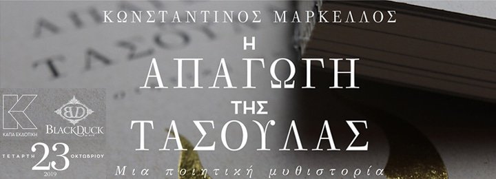 H ΚΑΠΑ ΕΚΔΟΤΙΚΗ και ο συγγραφέας – σκηνοθέτης ΚΩΝΣΤΑΝΤΙΝΟΣ ΜΑΡΚΕΛΛΟΣ σας προσκαλούν στην παρουσίαση της έκδοσης του θεατρικού έργου Η ΑΠΑΓΩΓΗ ΤΗΣ ΤΑΣΟΥΛΑΣ-Μια ποιητική μυθιστορία, την Τετάρτη 23 Οκτωβρίου 2019 στις 17.30 στο Black Duck (Χρήστου Λαδά 9α, Αθήνα, τηλ.: 2103234760).