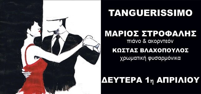 Ο συνθέτης και πιανίστας Μάριος Στρόφαλης, γνώριμος μας από τις μουσικές του για κινηματογράφο, τηλεόραση, θέατρο αλλά και τις tango συνθέσεις του, και ο σολίστ χρωματικής φυσαρμόνικας Κώστας Βλαχόπουλος, μέλος του tango σχήματος «Duo de dos», παρουσιάζουν ένα επιλεγμένο πρόγραμμα από παραδοσιακά Αργεντίνικα tangos από την περίοδο του μεσοπολέμου και μετά, καθώς επίσης και μεσογειακά tangos του Μάριου Στρόφαλη, στο Black Duck, τη Δευτέρα 1 Απριλίου.