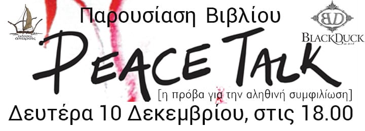 Μετά την επιτυχημένη πορεία της θεατρικής παράστασης του PEACE TALK στην Κομοτηνή, με την υποστήριξη της Δημοτικής Κοινωφελούς Επιχείρησης Πολιτισμού, Παιδείας και Αθλητισμού Κομοτηνής, στην Ξάνθη, στην Αλεξανδρούπολη, στην Θεσσαλονίκη και στην Αθήνα- με τη στήριξη και χορηγία της Βουλής των Ελλήνων – στην Τεχνόπολη Δήμου Αθηναίων και στο Κατάστημα κράτησης γυναικών Ελεώνα Θήβας οι εκδόσεις Άπαρσις και η συγγραφέας Χριστιάνα Λαμπρινίδη σας προσκαλούν σε μια ιδιαίτερη, βιωματική παρουσίαση του βιβλίου «PEACE TALK- Η πρόβα για την αληθινή συμφιλίωση», την Δευτέρα 10 Δεκεμβρίου, στις 18.00 στο Black Duck Χρήστου Λαδά 9.